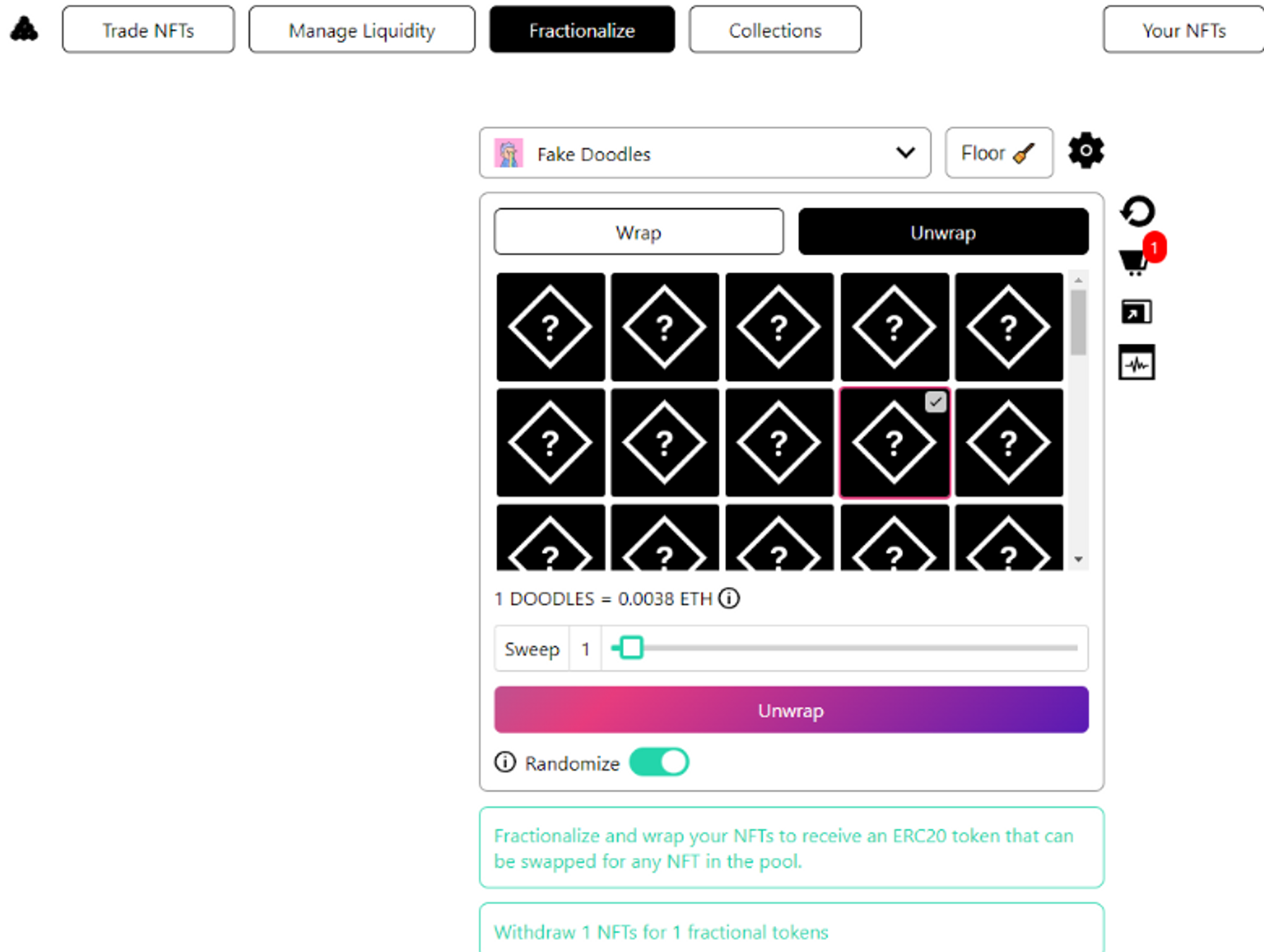 You can choose to randomly withdraw an NFT for no fee. In order to unwrap into a whole NFT you need to have at least 1.0 fractional tokens. If for example you have 0.5 fDoodles tokens, you can navigate to the trade NFTs page and click the cogwheel to select fractional. You can then buy 0.5 fDoodles tokens which will be enough to withdraw 1 Doodles NFT by unwrapping it.&#x20;
